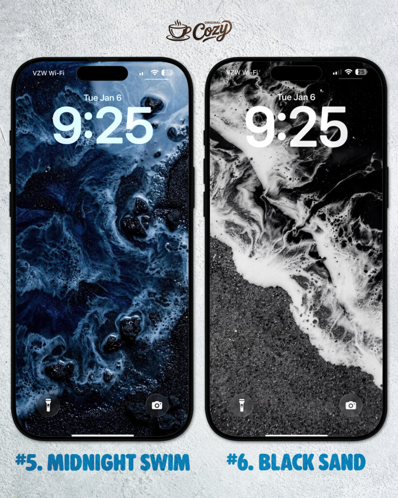 ๐ŸŒŠ THE VIBE From sun-drenched turquoise shoals to moody, volcanic black sand at midnight, this pack covers the full spectrum of coastal aesthetics. We designed these specifically for high-resolution OLED displaysโ€”the deep blacks and vibrant teals pop while keeping your clock and widgets perfectly readable.